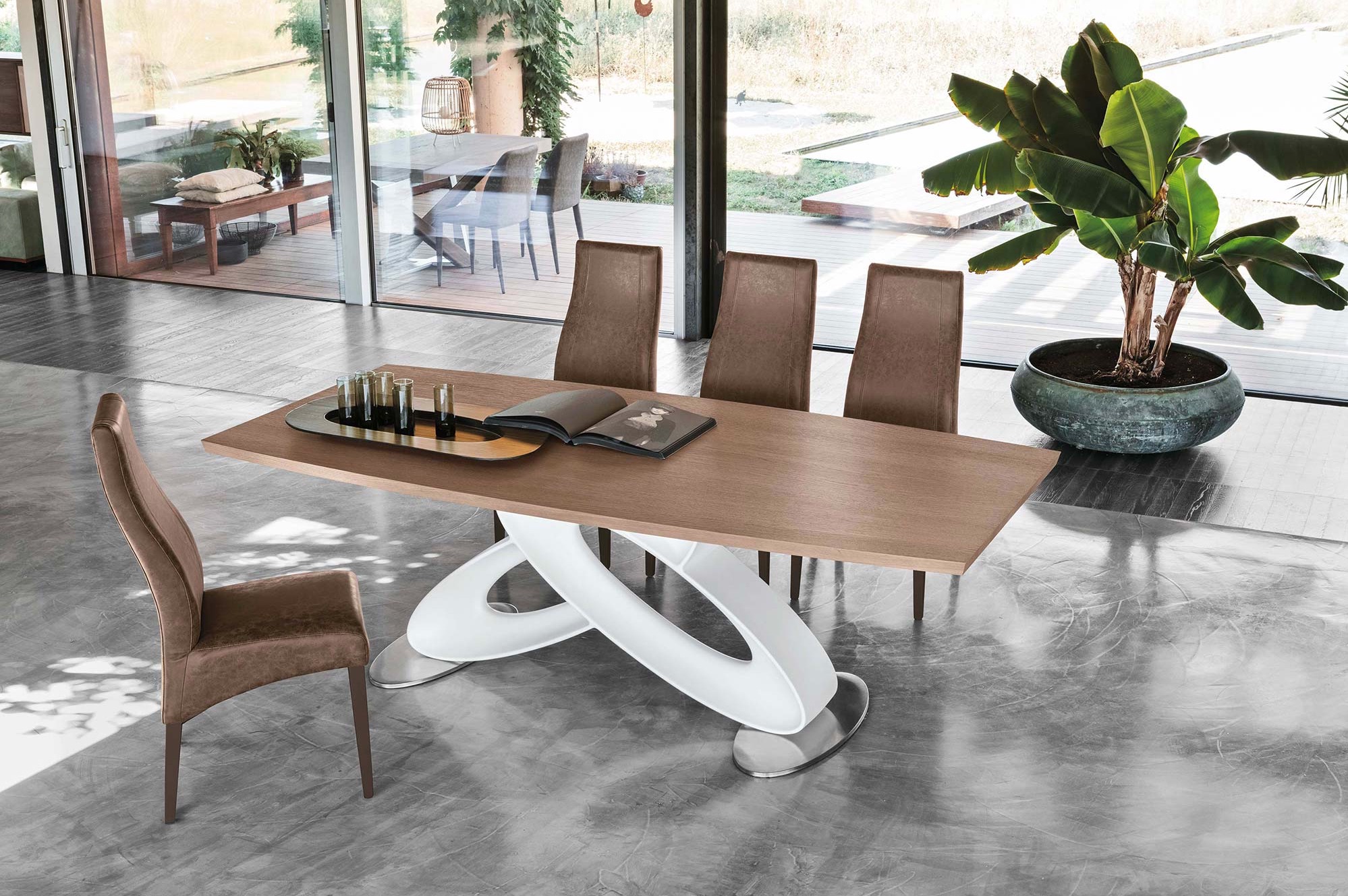 Otra de las últimas tendencias se basa en la naturaleza, que es auténtica y crea espacios de calma y bienestar. Queda claro que los materiales naturales nos proporciona piezas únicas, exclusivas e irrepetibles, y entre las mesas modernas de comedor podrás encontrar tableros cortados con la forma del árbol, dando lugar a bellas irregularidades.